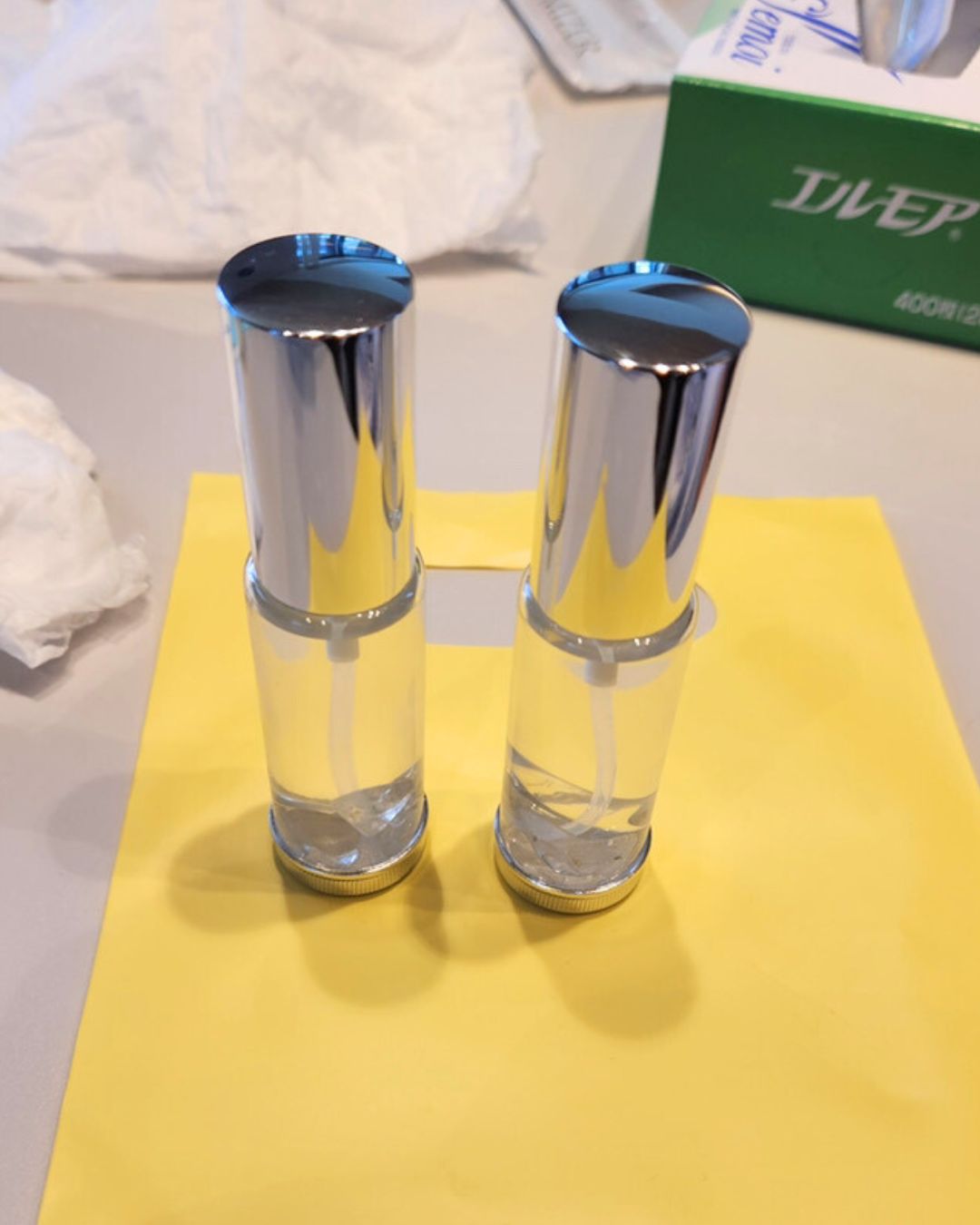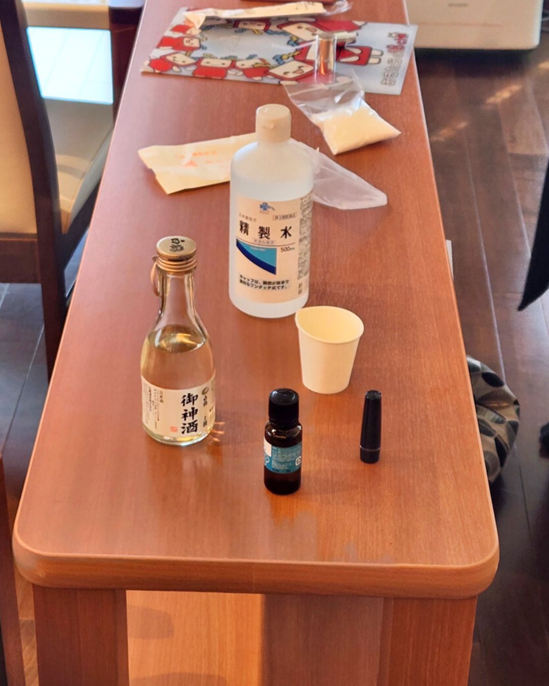 「日本酒(清酒)」と「精製水」、そして「細石水晶」、「アロマオイル」の4つの材料で作ります。
