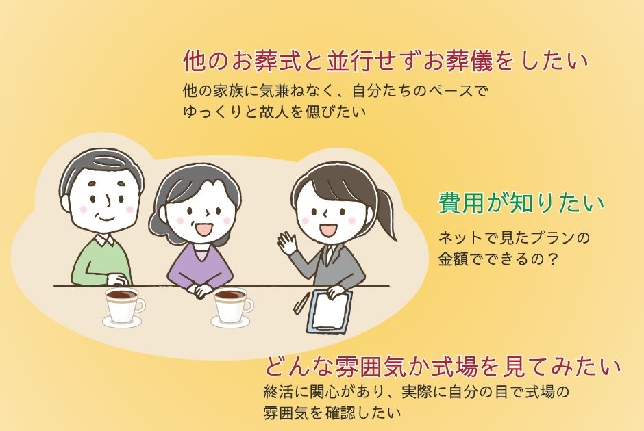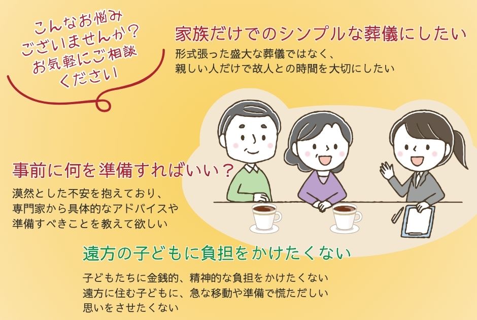 そんなとき、事前相談で準備しておけば、いざというときも慌てずに、大切な方の最期を悔いなく送ることができます。